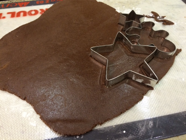 7. Remove dough from fridge and save plastic wrap. Heat oven to 375ºF. Using a small amount of potato or tapioca starch on the counter and plastic wrap on top, roll out dough to 1/4″ thickness. Use a cookie cutter to cut out shapes.