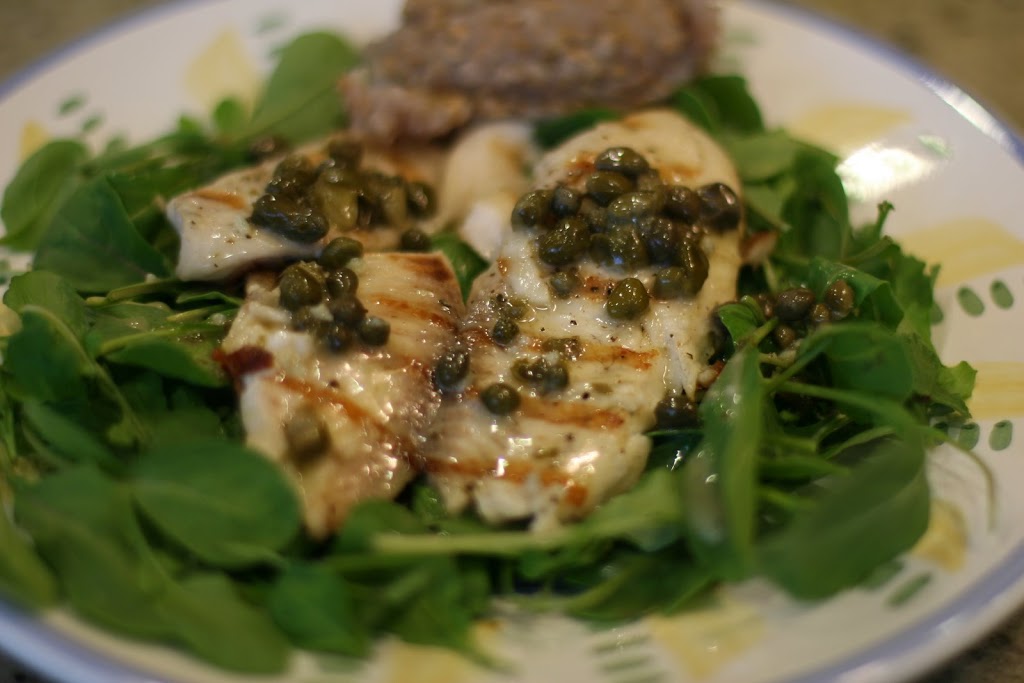 Grilled Fish with Lemon Caper Sauce on a Bed of Organic Arugula