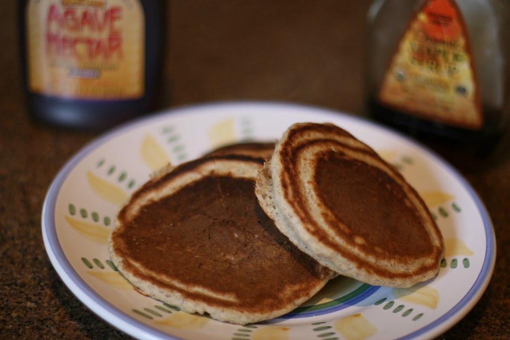 Mix all ingredients. Place a non-stick, square griddle on the stove top and heat to medium. Pour batter onto griddle to make 4 pancakes (about 1/2 cup of batter per pancake). Cook until you see bubbles on top. Flip over and cook a minute or so. Serve with organic maple syrup and/or agave nectar. You can also add fruit like sliced bananas, blueberries, raspberries or thinly sliced apple. Enjoy!