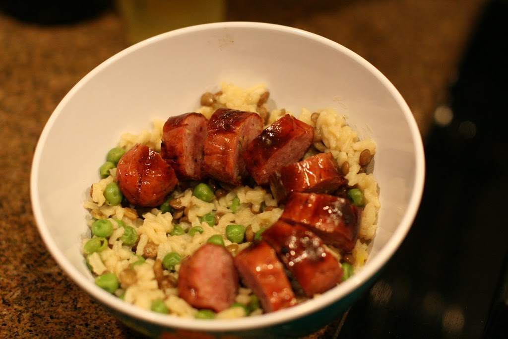 Grilled Italian Sausages served on top of Lentil-Rice Pilaf with Peas.