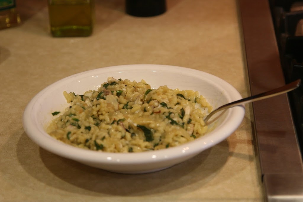 For his birthday, a friend gave Santo a little Remy doll (the very talented rat chef in “Ratatouille”). For the last few months, I’ve been hearing it say “I’m going to make something special…something with saffron!” Are you laughing that this is what inspired me? So, that’s how the first real meal in the kitchen was born. I sauteed the onions with care, added saffron and black pepper, a little wine and then the chicken broth. Yum, yum, yum.