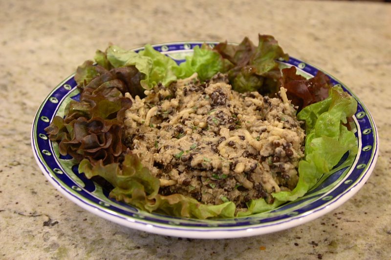 I had always thought that a barley salad would be a good Halloween dish since this grain sort of looks like a bug when it’s cooked. I was looking through the pantry and saw some black lentils (which look like little black balls) and red lentils. I decided to cook them all separately, adding broken spaghetti to the lentils to use as the worms. Of course, the only thing I forgot that was that when the red lentils cook, they turn yellow. Oh well. One other bit of advice is to cook everything separately; otherwise you’ll have just a bunch of black things in a bowl.