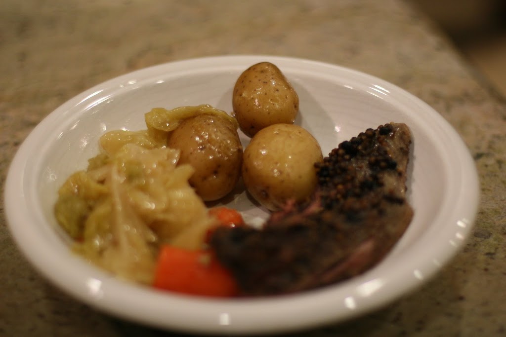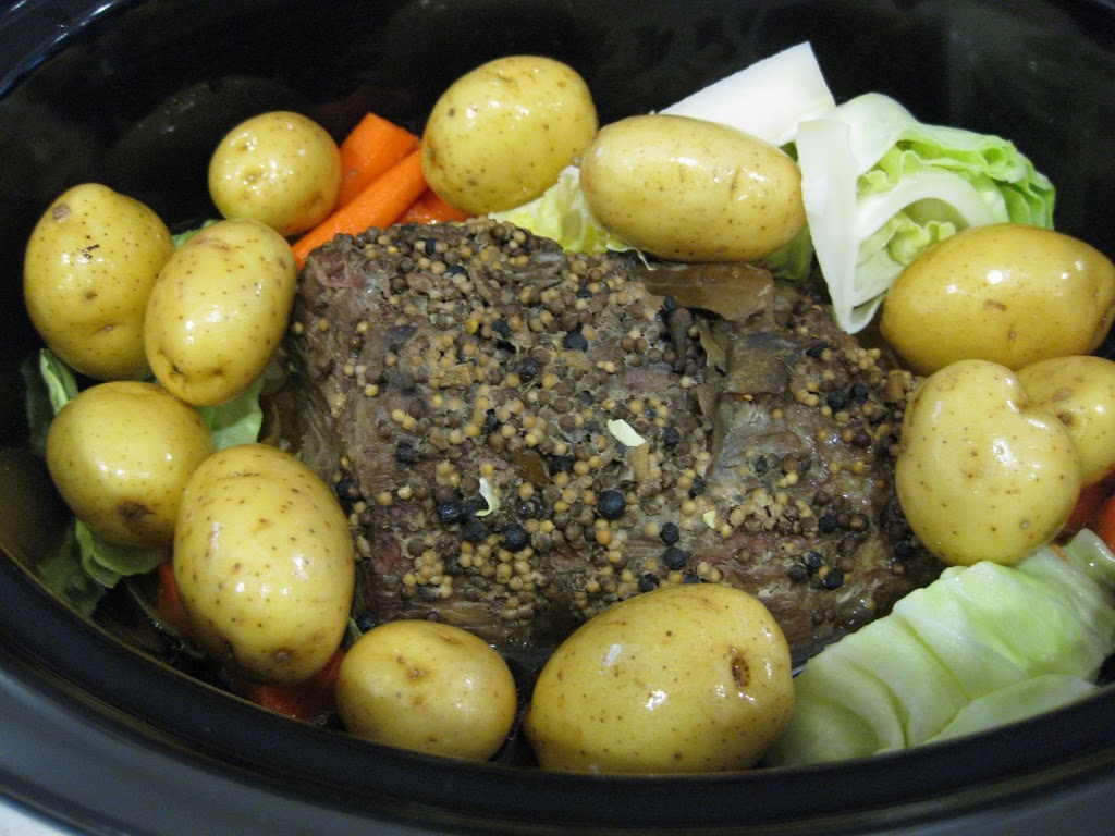 You can remove the meat and allow it to rest on a cutting board, covered, while you cook the veggies and potatoes. I like to use 3-4 peeled carrots, cut into chunks, 1/2 head to a whole head of cabbage, cut into wedges and little “creamer” potatoes (count the number of people eating and multiply by 2 or 3). All of these should cook for 30-45 minutes on high or maybe 60-90 mins on low. Make sure all of the vegetables are tender, checking half way through the cooking time.