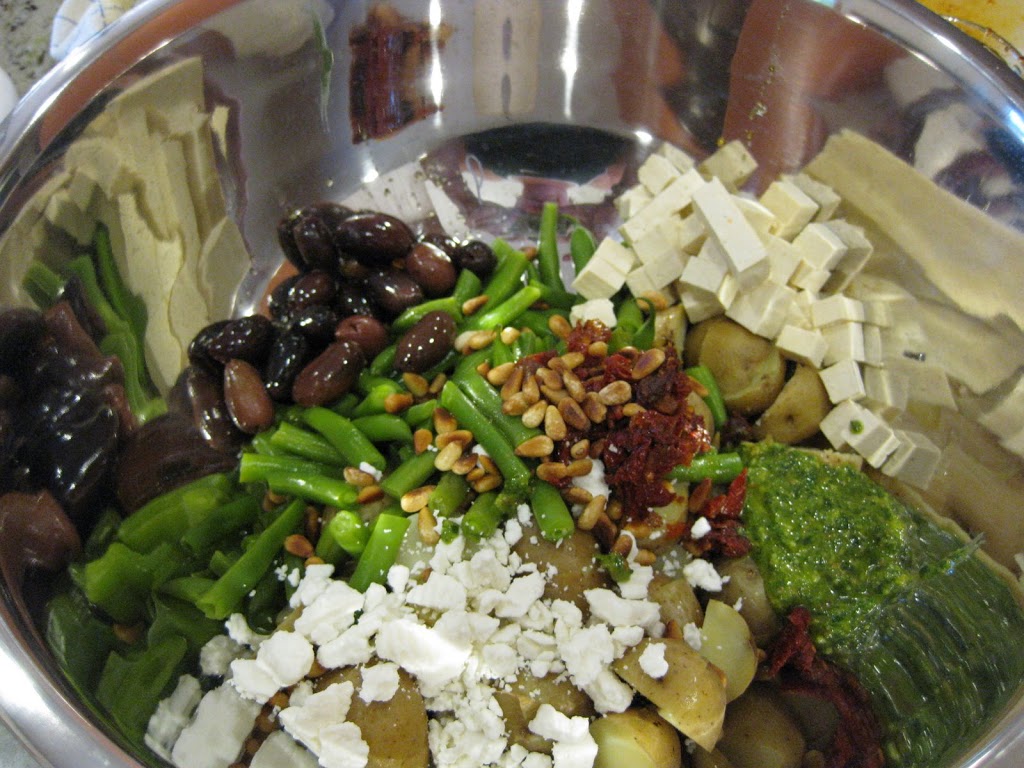 The first time I made it, I didn’t have cherry tomatoes; I used sun-dried instead. At the Ferry Building for my demo, we used toasted walnuts both in the salad and in the pesto. If you want to have it for dinner, add some tofu (as seen in the picture), chicken or garbanzo beans. Once the green beans and potatoes are cooked, this dish is a snap to put together. Give it a try! (I’ll post the video I made at the Ferry Building at some point; check back!).
