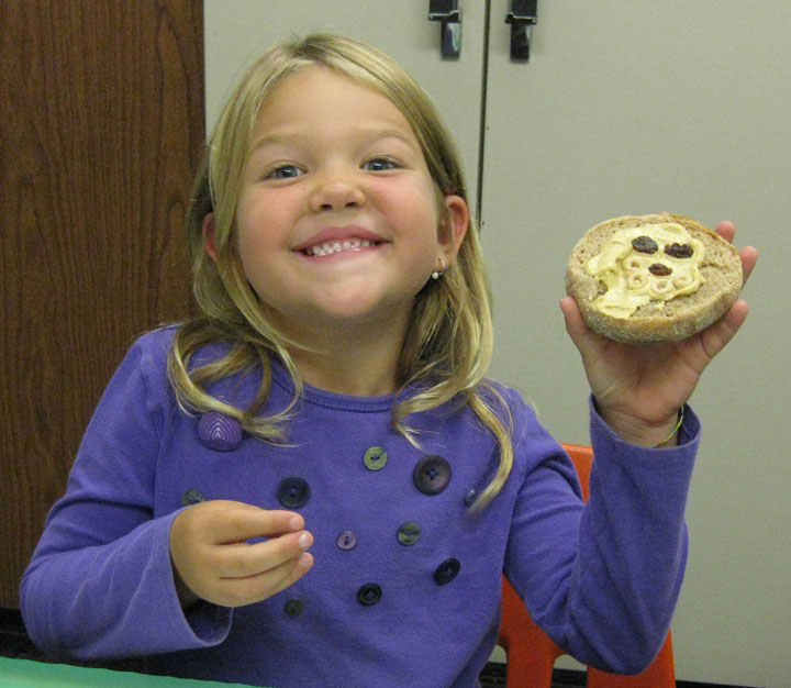 We served it on English muffins and then gave the children raisins and Cheerios with which to make faces. It’s also good as a dip for pretzels (think salty with sweet; yum) or apples and would be great on a pumpkin muffin. You could even make a sandwich out of it with sliced apples…not a bad idea!