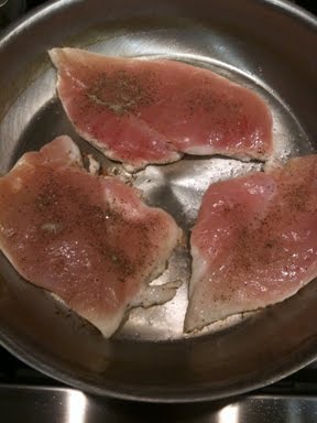 4. Once chicken is browned and beginning to turn white on the sides (you will be able to see and smell this), turn over and cook on the other side. Again, do not move around in the pan and try not to over cook.