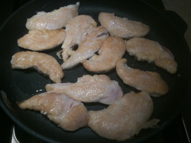 3. Heat medium to large non-stick pan with the oil. When the oil is hot, add the chicken tenders and cook on each side until the chicken is lightly browned. The chicken may not be done but will continue cooking in the slow cooker. Place chicken in slow cooker.