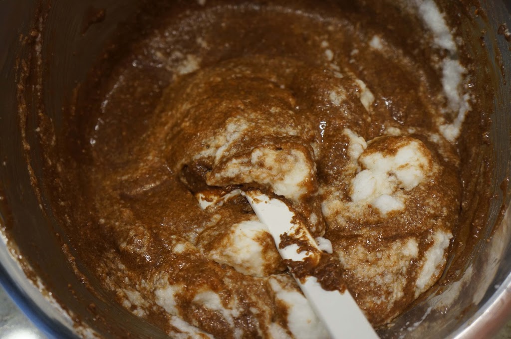 7.Fold in ¼ of the egg whites at a time into the chocolate mixture.