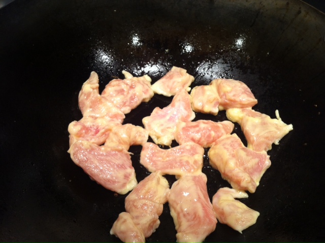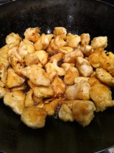 5.Place 1 tablespoon of oil in the wok and heat to medium-high. 6.Working in batches, carefully add about 1/3 to 1/4 of the chicken. Cook until golden brown on each side. You do not have to fully cook the chicken as it will finish cooking in the sauce but make sure the pieces are browned. Place pieces on a large plate or tray while you finish cooking the remainder of the chicken.