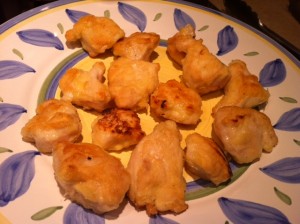 I found an orange chicken recipe on Food.com and made a few changes in the ingredients as well as the technique until I came up with the following. I served it to the family along with some brown rice and previously steamed green beans.