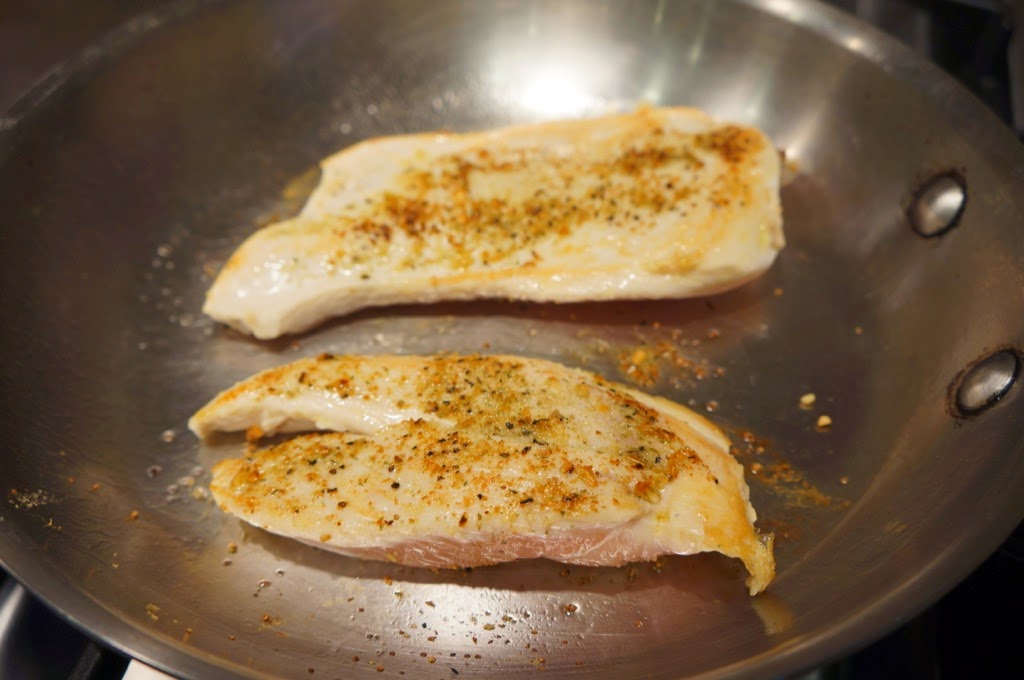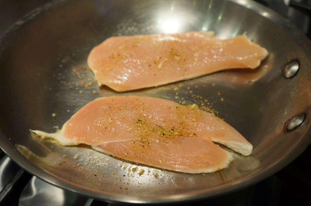 3. Do not move chicken in the pan. Sprinkle remaining seasoning on other side of chicken. Adjust heat if necessary so that you can hear the chicken cooking but so that it’s not burning.