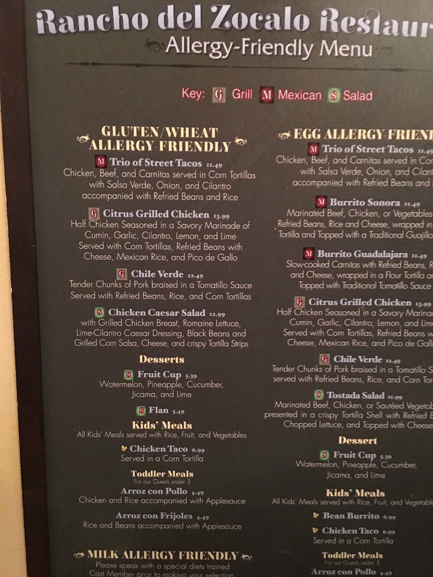 Storyland Cafe-We ate at the character breakfast. Half of the buffet was muffins and danishes but they other half had great proteins. The only thing we couldn’t eat was the chilaquiles (chips fried with gluten items). The quality of the buffet was very good. We were able to order allergen-friendly pancakes and Mickey waffles. They also provided toast. Great way to start our day.