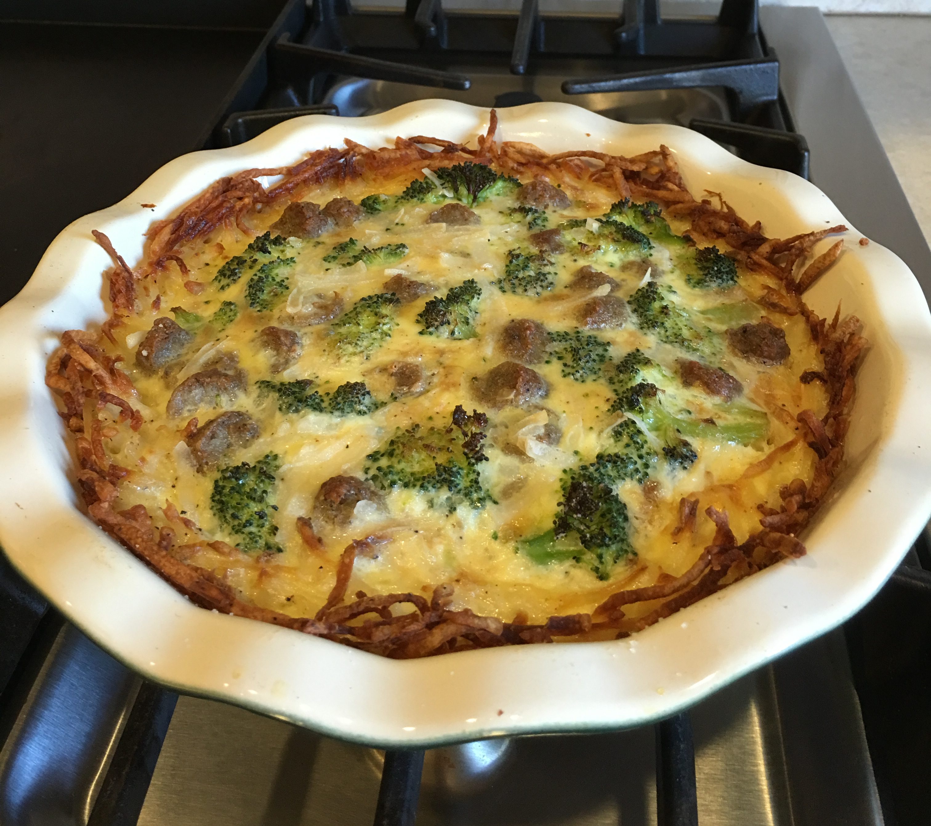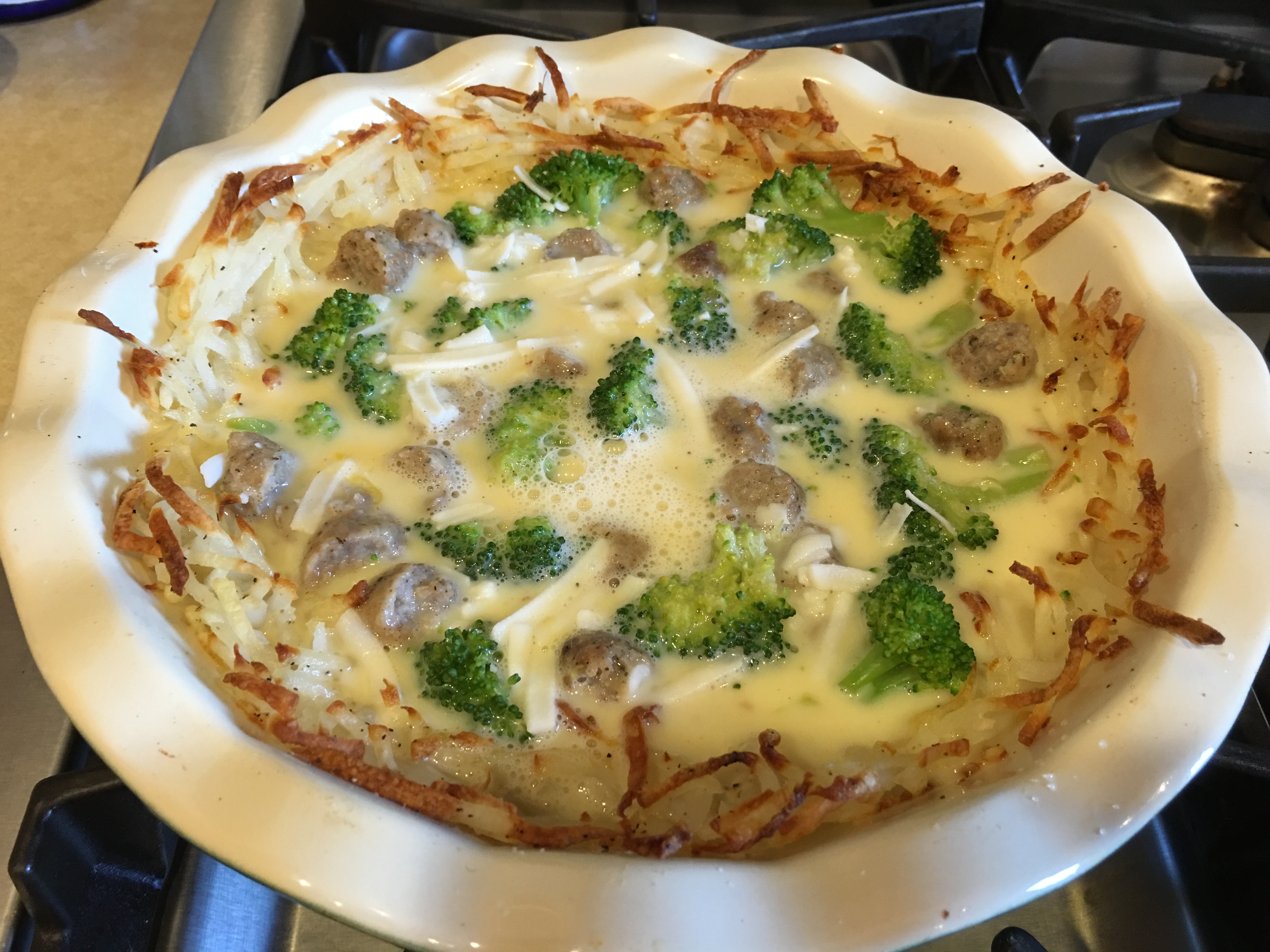 If you have other fillings you want to use, do so! Be creative. The key to the recipe is pre-baking the crust with the hash browns, then adding the egg mixture and then finishing the baking. It really is quite good. Here’s one I made with broccoli and sausage. Before and after shots.