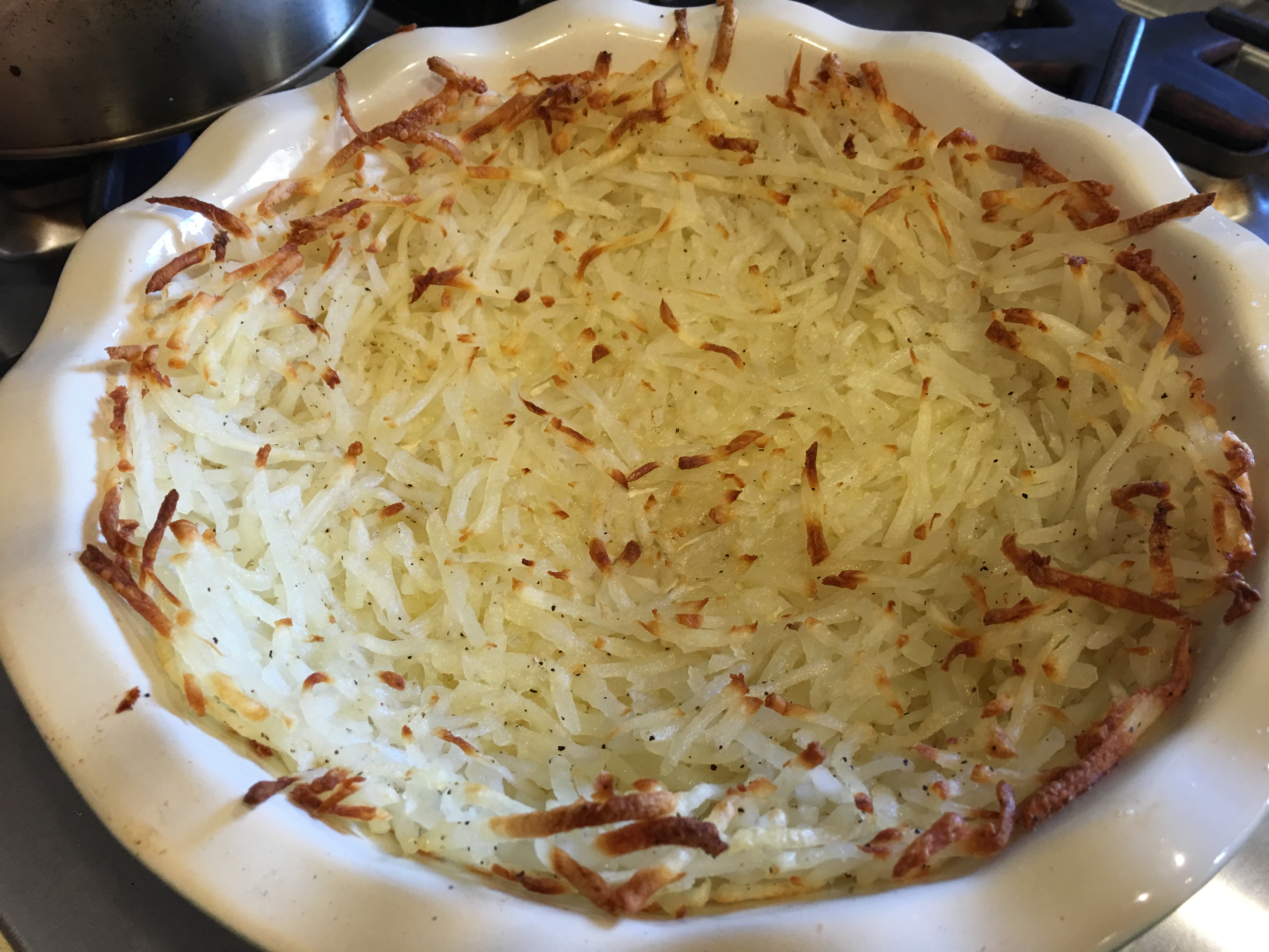 - In a medium bowl, mix potato, oil, salt and pepper. Press potato into pie dish and up sides. Place in oven and bake 20-25 minutes or until beginning to brown.