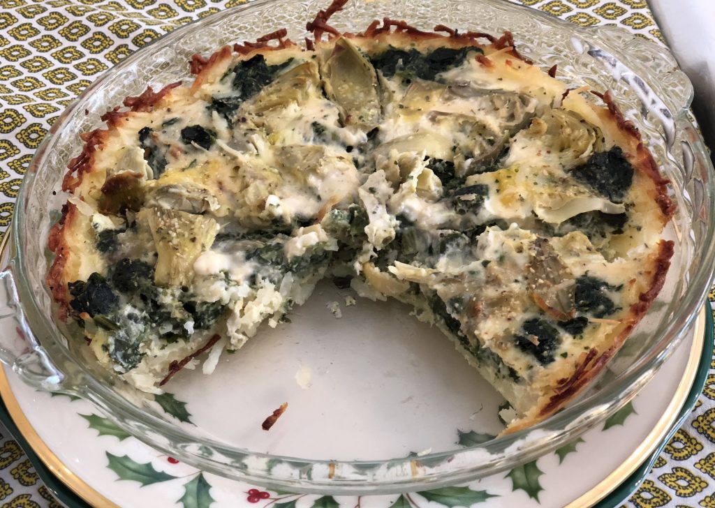 For this quiche, I used a recipe similar to the one my aunt used to make at holidays. Hers had spinach, artichokes, and cheese. Since I eat dairy-free, I chose Follow Your Heart vegan parmesan shreds. I usually use plain almond or coconut milk instead of cow’s milk. When we say “dairy” we are really referring to the protein “casein” which is the common protein found in milk from mammals. So even though this recipe uses eggs, it is in fact dairy-free.