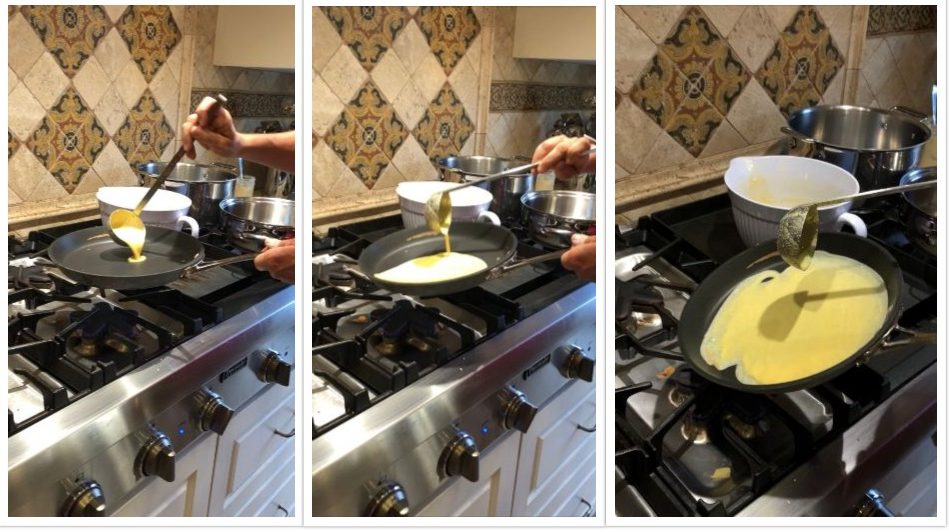 - Heat non-stick crepe or sauté pan (about 8”-10″ across) to slightly hotter than medium heat. Make sure the pan is hot; this is key to a good crepe. Add a small amount of olive oil to the pan.