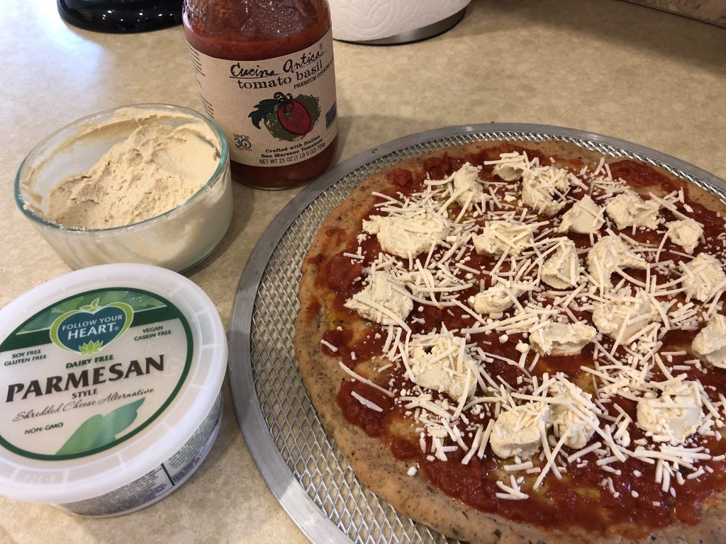 - To use the cashew cheese on pizza, add tomato sauce (or sauce of choice) to crust first. Using a tablespoon or soup spoon, add dollops of the cashew cheese to the crust, spreading slightly. I like to also add a vegan parmesan-style shred. Follow Your Heart is my preferred brand. Bake in a 475F oven until the crust is crisp and the cashew cheese just starts to brown on the edges. Cool before cutting.